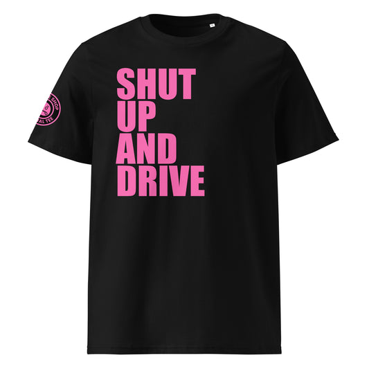SHUT UP AND DRIVE T-Shirt – Black & White | Vibrant Pink Print | Car Meet Selection | Zip It Logo | DTF Print