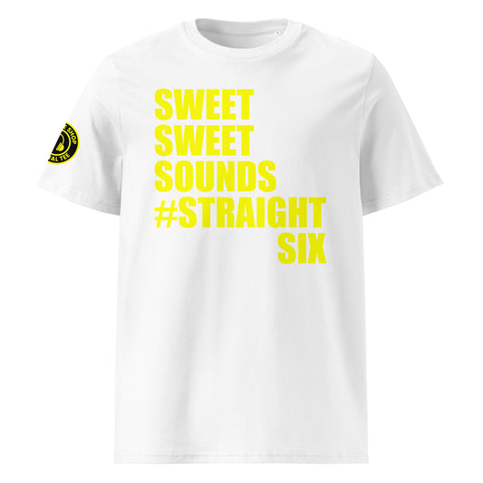 SWEET SWEET SOUNDS #STRAIGHTSIX T-Shirt – Black & White | Vibrant Yellow Print | Car Meet Engine Tribute | Ear Muffs Logo | DTF Print