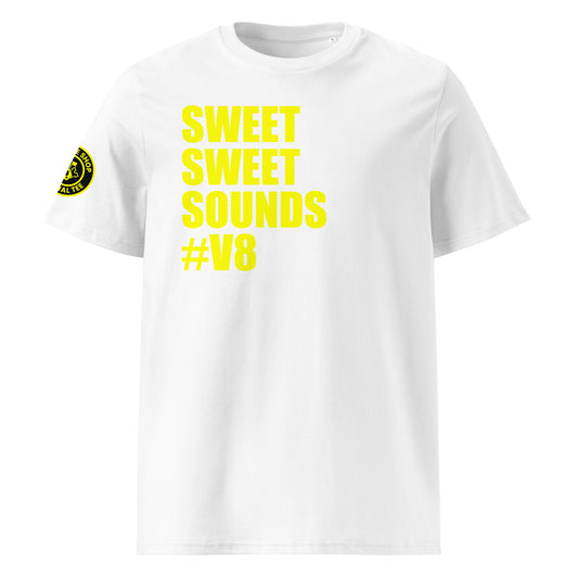 SWEET SWEET SOUNDS #V8 T-Shirt – White | Car Meet Engine Tribute | Engine Logo | DTF Print
