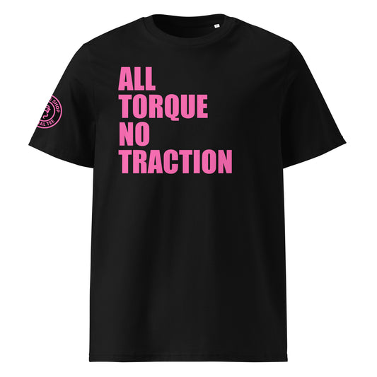 ALL TORQUE NO TRACTION T-Shirt – Black & White | Vibrant Pink Print | Car Meet Slogan | Traction Control Logo | DTF Print