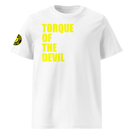 TORQUE OF THE DEVIL T-Shirt – Black & White | Vibrant Yellow Print | Car Meet Slogan | Devil Logo | DTF Print